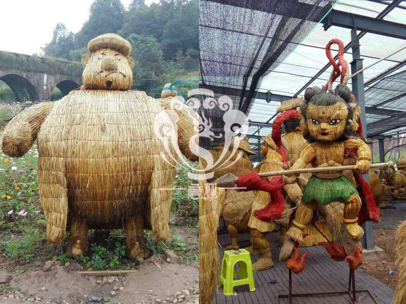 現在的精致稻草人藝術通常是由專業美術老師的造型放樣,然后由焊工師傅焊接出立體造型造型,然后以稻草或者稻草繩為材料編捆制作而成。
