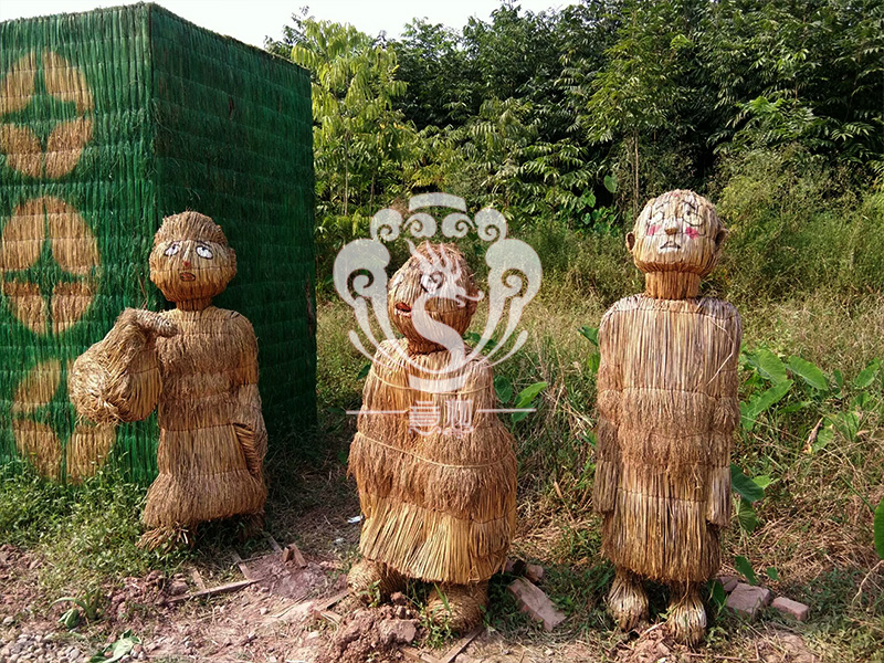 現在的精致稻草人藝術通常是由專業美術老師的造型放樣,然后由焊工師傅焊接出立體造型造型,然后以稻草或者稻草繩為材料編捆制作而成。