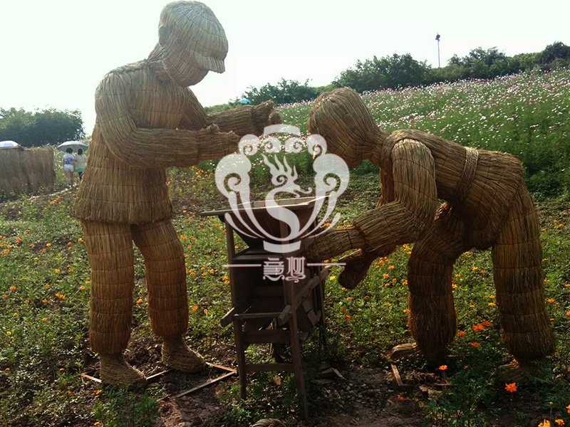 現(xiàn)在的精致稻草人藝術(shù)通常是由專業(yè)美術(shù)老師的造型放樣,然后由焊工師傅焊接出立體造型造型,然后以稻草或者稻草繩為材料編捆制作而成。