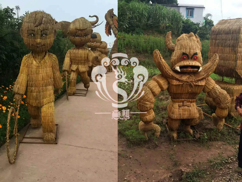 現(xiàn)在的精致稻草人藝術通常是由專業(yè)美術老師的造型放樣,然后由焊工師傅焊接出立體造型造型,然后以稻草或者稻草繩為材料編捆制作而成。