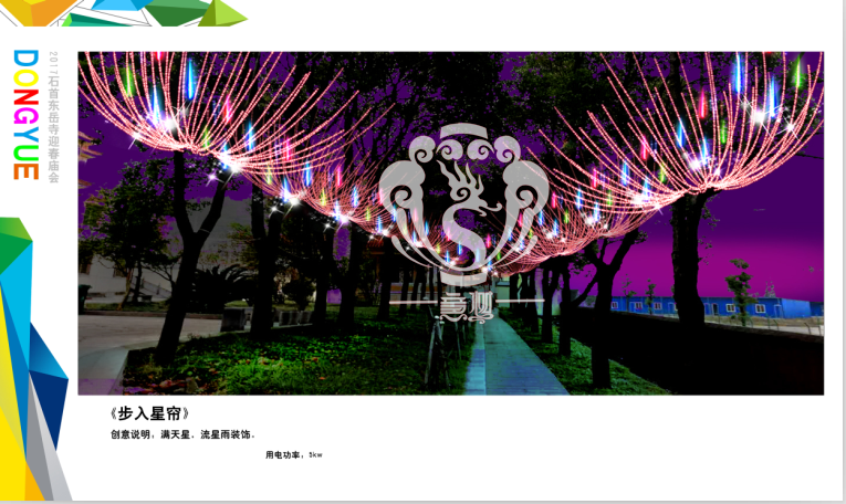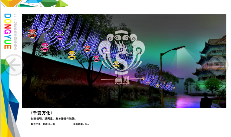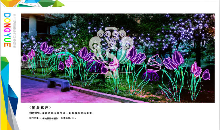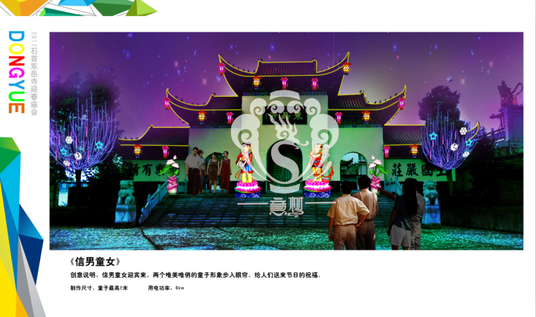 本次設計方案形式新穎、亮點突出、格調高雅,與“迎春、禮佛”的主題環環相扣,喜慶的節日氛圍在這交相輝映的盛世燈組中得到體現,讓整個東岳寺充滿著舞動心弦的魅力。透過本次高品位氛圍體會到時代發展為人們帶來了更新、更加美好的幸福生活。
