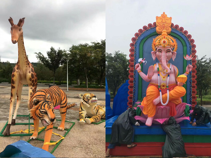 來自自貢的彩燈匠人們冒雨施工2017青島世博園賞燈會亮燈儀式成功