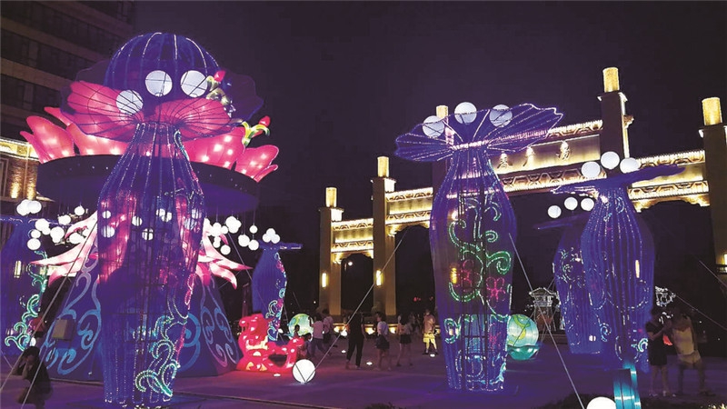 伴隨著夜幕降臨,散落在諾睿德非遺交流中心周圍的彩燈散發著柔和的光彩,彈著琴的“功夫熊貓”、桃園結義的劉關張……一組組彩燈再現影視劇中的經典畫面,彰顯著“電影搖籃”的氣質。