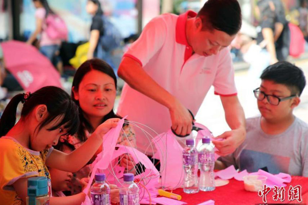 6月25日,“慶祝香港特別行政區(qū)成立20周年紀(jì)念--華燈閃爍耀香江”大型傳統(tǒng)扎作花燈展暨文化傳統(tǒng)親子工作坊在中環(huán)舉行,展出傳統(tǒng)民間扎作花燈。圖為市民在學(xué)習(xí)紮作傳統(tǒng)花燈。